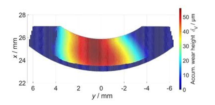 由于磨損與邊界摩擦和接觸中的滑動距離相關(guān),因此使用能量模型基于摩擦能計算磨損。根據(jù)這個能量概念,摩擦能不會完全以熱能的形式消散,而是不可逆地以機械引起的網(wǎng)格缺陷形式儲存在材料中。能量會不斷累積,直到達到臨界水平,這會導致材料斷裂和磨損。